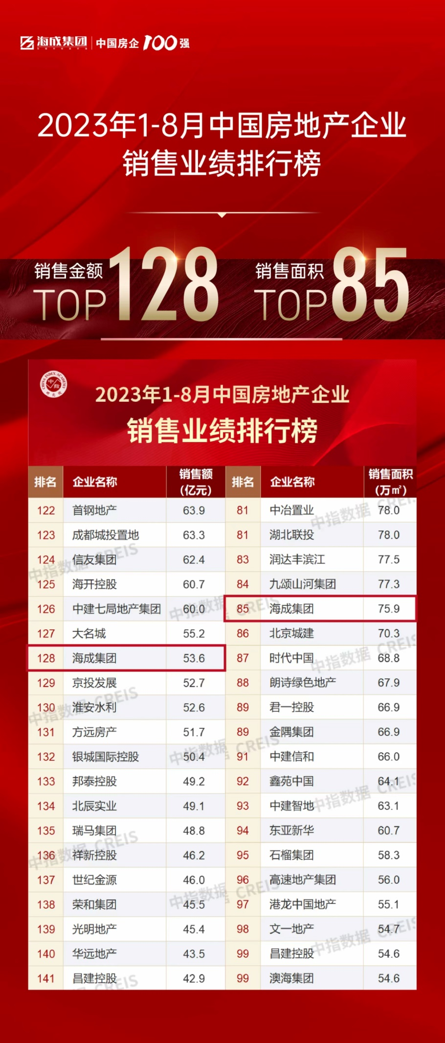 在中指研究院最新数据中,海成以53.6亿元的销售额,位列1-8月全国房地产企业销售业绩榜第128名;以75.9万㎡的销售面积,位列1-8月全国房地产企业销售业绩榜第85名。