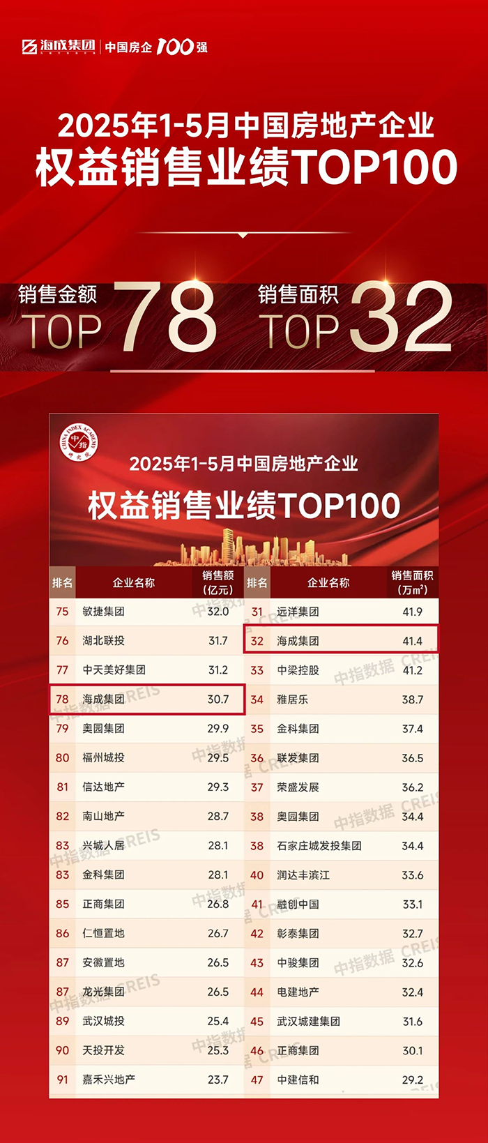 海成集团再度凭借强劲实力荣耀登榜,于中指研究院最新发布的《2025年 1-5 月全国房地产企业销售业绩排行榜》中斩获亮眼成绩。以卓越表现跻身全国房企销售金额 TOP87、销售面积 TOP42、权益销售金额 TOP78与权益销售面积 TOP32的佳绩。