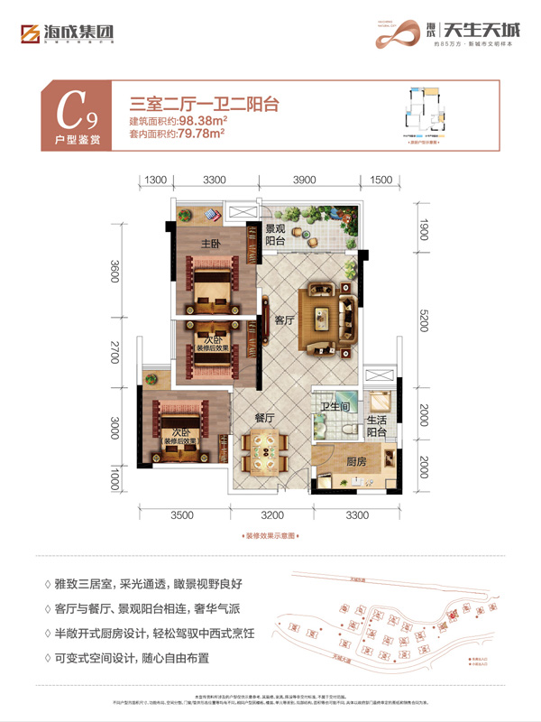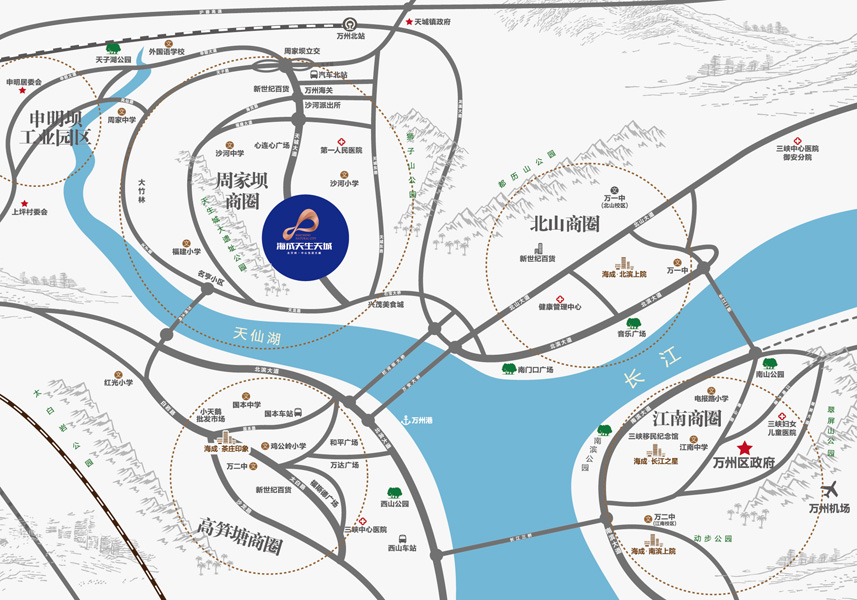 海成·天生天城,位于周家坝心连心广场旁,占据城北核心位置,帷幄城市稀贵土地,扛鼎万州战略发展区域;项目汇集丰富业态,以双城市公园、菁英医教、智慧社区、社区商业中心、生态商业公园、文旅休闲街区、主题旅游景区、格调餐饮、半山民宿等多元配套,为业主提供美好居家体验;同时以星级物业、五彩生活家体系、全龄架空层等匠心设计为一体;融合休闲、娱乐、健康、医教、文旅等元素,构筑多功能全能生活圈;三好生活大城始于一座天生天城。